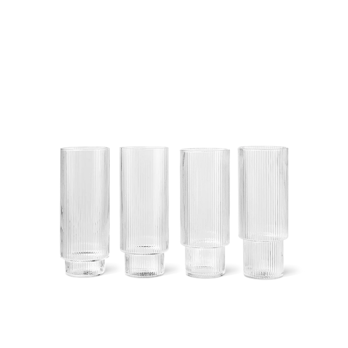 Channelling a sophisticated feel with their rippled surface of the mouth-blown glasses, the Long Drink Glasses are a natural part of an evening in good company. Individually shaped geometric forms are the foundation of this dynamic glass series, equally aesthetic and functional. Pour in your favourite drink and watch as an iridescent play of light and textures appears in the ripples of the glasses.